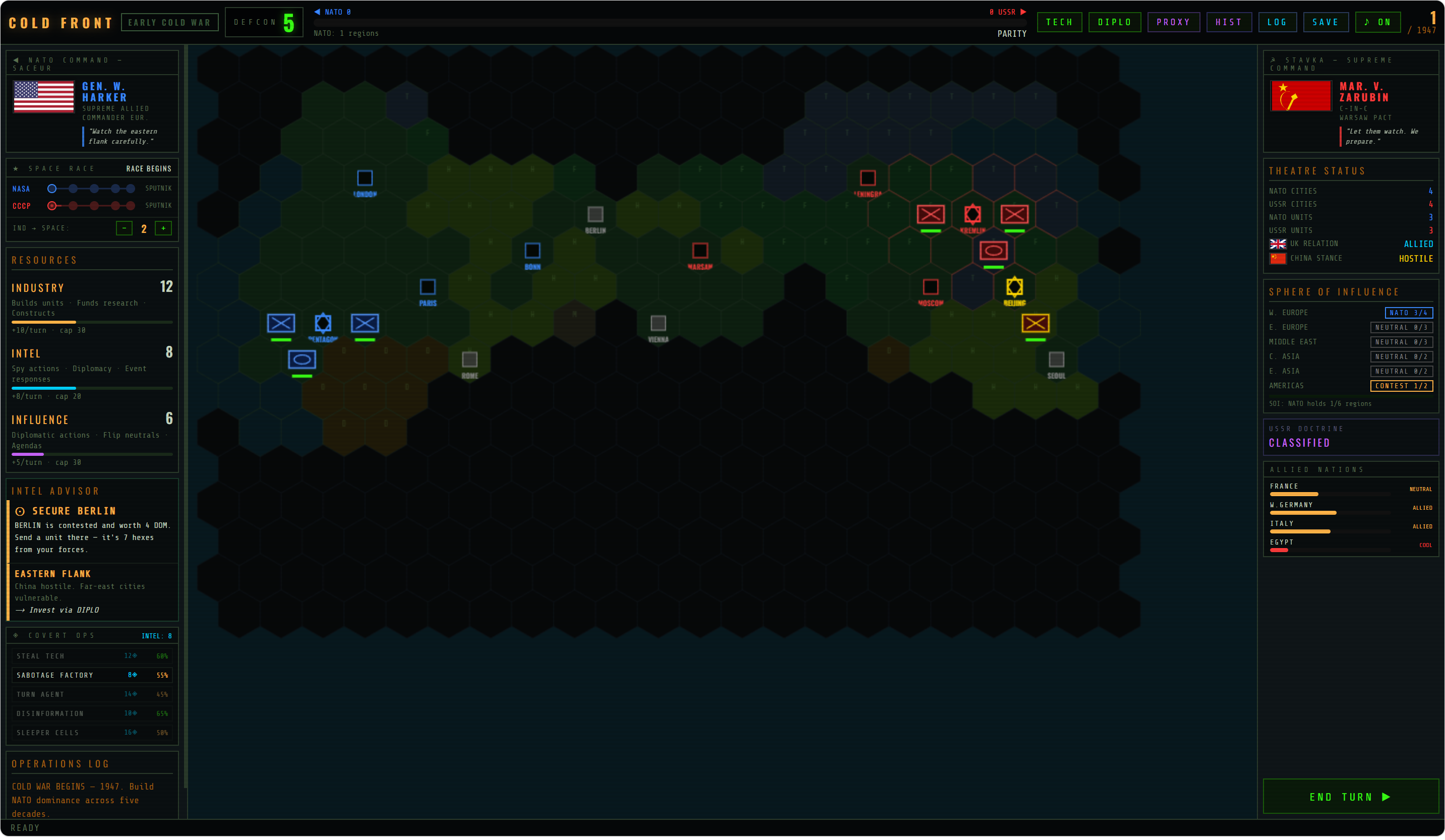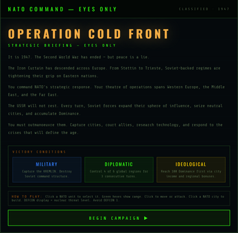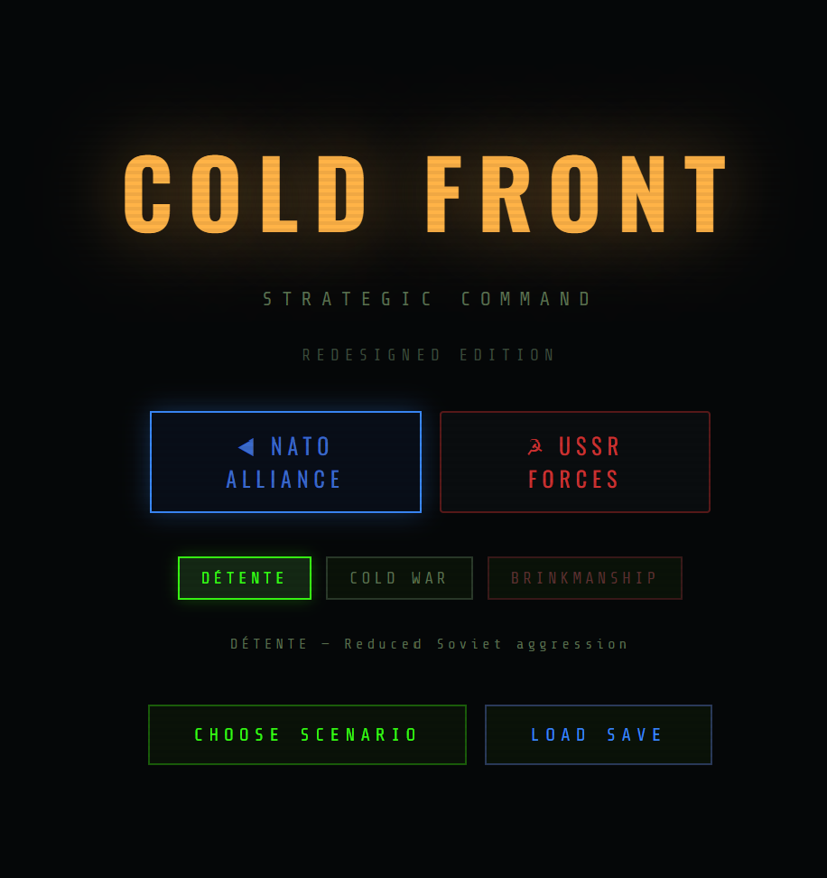 Cold Front is a turn-based Cold War grand strategy game played on a hex map spanning Western Europe, Eastern Europe, the Middle East, Central Asia, and the Far East. You command either NATO or the Soviet Union across a 25-turn campaign from the Berlin Crisis to the fall of the Iron Curtain, managing military forces, industrial output, intelligence networks, diplomacy, and the ever-present threat of nuclear annihilation.