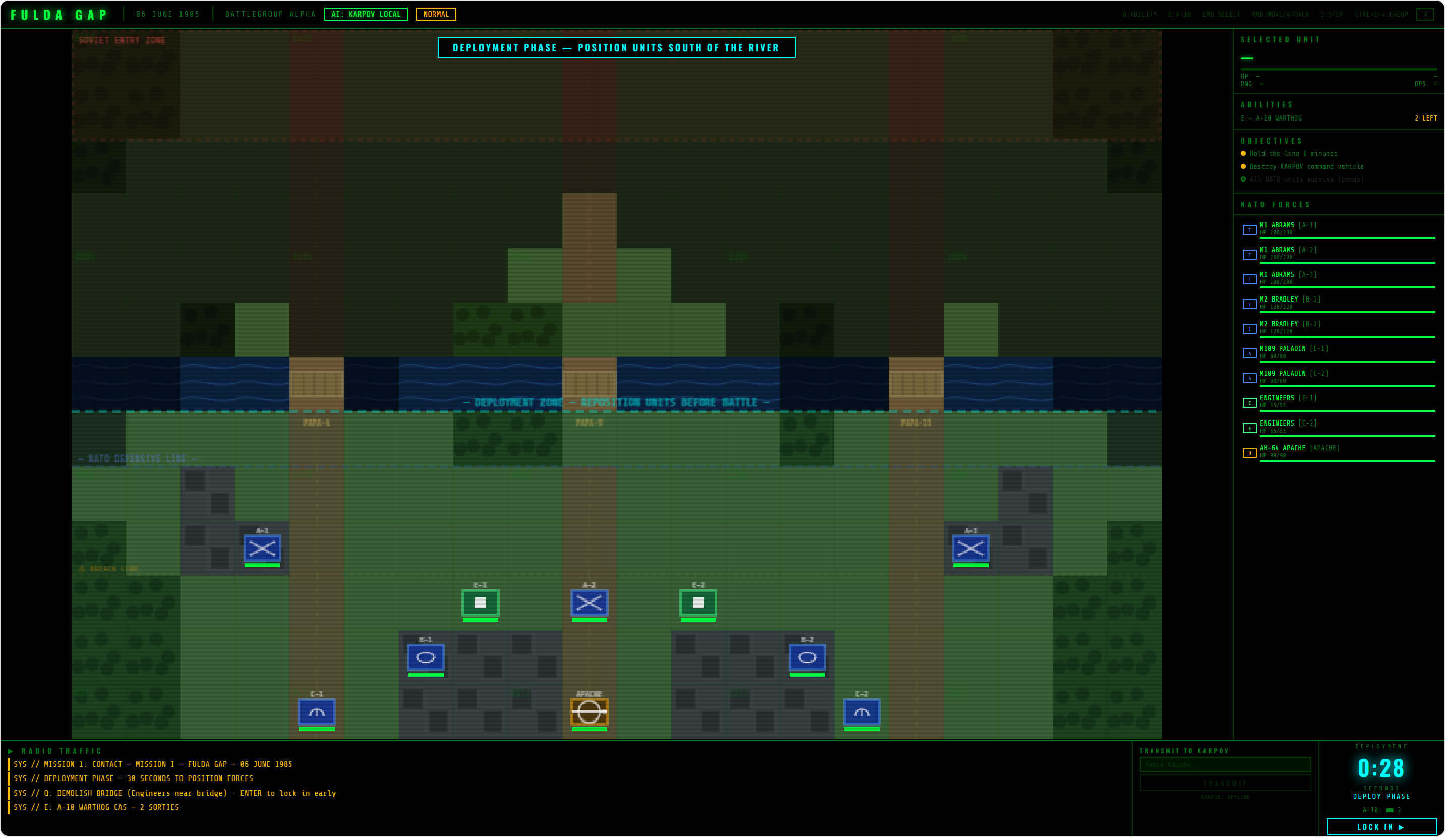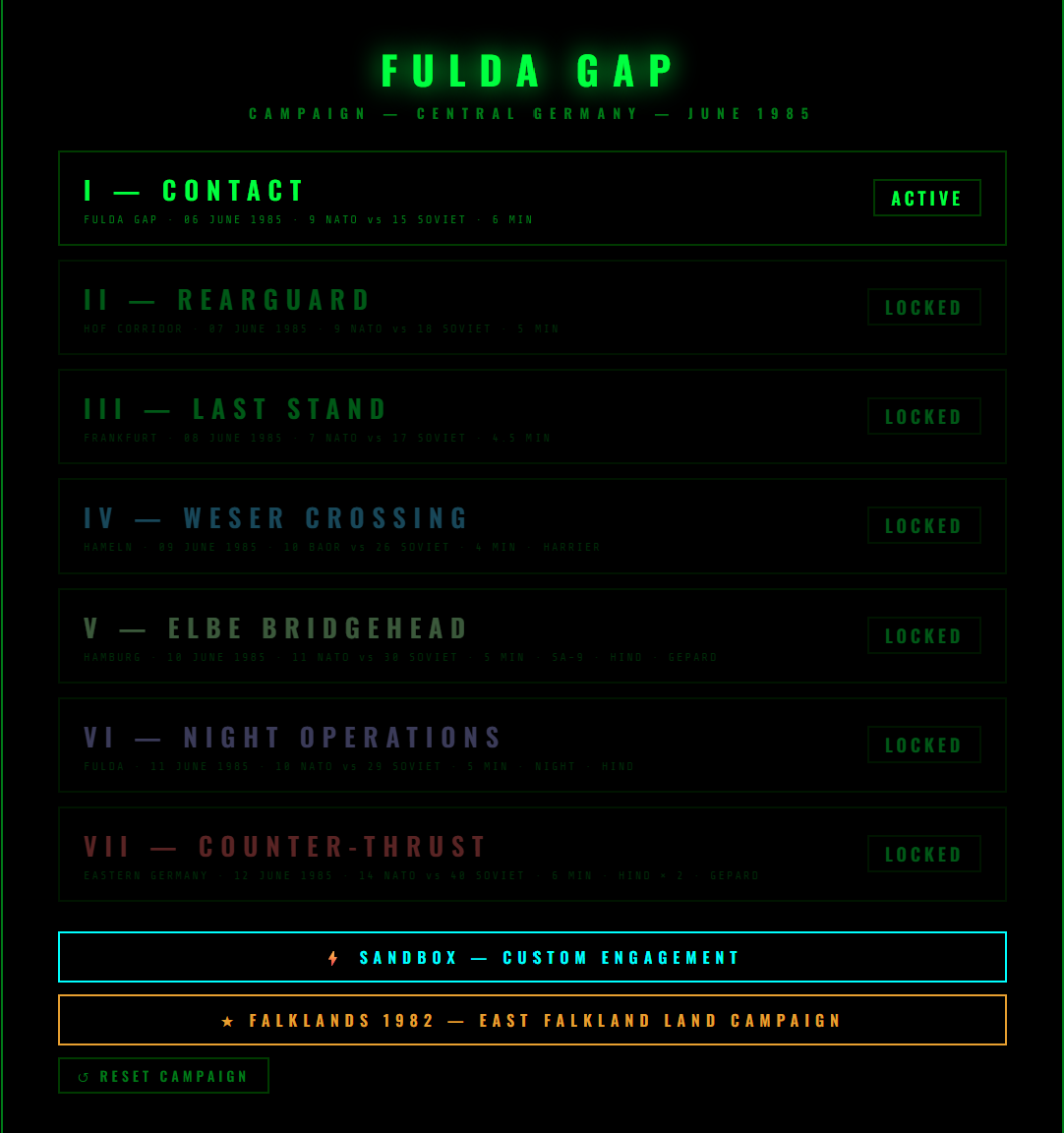 Cold War — Central Europe, June 1985 Seven missions across the Fulda Gap, Hof Corridor, Frankfurt Approaches, the Weser and Elbe river lines, and a decisive night action. The campaign escalates from a desperate rearguard to a full V Corps counter-thrust, with Colonel Karpov commanding the Soviet forces throughout — and talking to you on the radio the entire time.