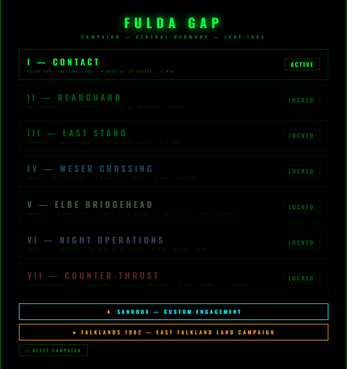 FULDA GAP is a real-time tactical browser game set at the flashpoint of a hypothetical World War Three in Central Europe — and in the South Atlantic three years earlier. Command NATO and British forces across two full campaigns, manage your units under fire, call in air strikes, and hold the line against overwhelming Soviet armour.